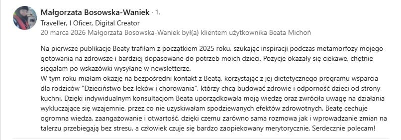 Dziś dziękuję „Bogu”, że natrafiłam na Panią Beatkę Michoń - dietetyk dziecięcą. Mój syn przestał chorować, wszelkie infekcje wirusowe i bakteryjne odpuściły, skończyło się odwieczne zapalenie płuc i zatkane noso – gardło. Ustały też nocne poty, wymioty i biegunki. Syn przestał opuszczać zajęcia w przedszkolu, systematycznie zaczął uczestniczyć w zajęciach sportowych na świeżym powietrzu, skończyły się problemy z perystaltyką jelit, a tiki się cofnęły.