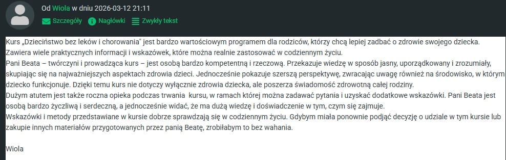 Czyżby prawdziwa wiedza, była zakazana? A może strzeżona przez koncerny farmaceutyczne? Nie potrafię odpowiedzieć na to pytanie, ale jedno jest pewne, Pani kurs ratuje zdrowie dzieci na całym świecie!